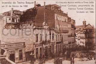 Postal da Fábrica Tomaz Cardoso com alusão ao incêndio do antigo teatro portuense "Teatro Baquet" ocorrido em Março de 1888. Mandado construir em 1858 pelo alfaiate portuense António Pereira Baquet, este teatro tinha a sua entrada principal na rua então chamada de Santo António (hoje, 31 de Janeiro). No postal podemos ver a entrada pela Rua de Sá da Bandeira.